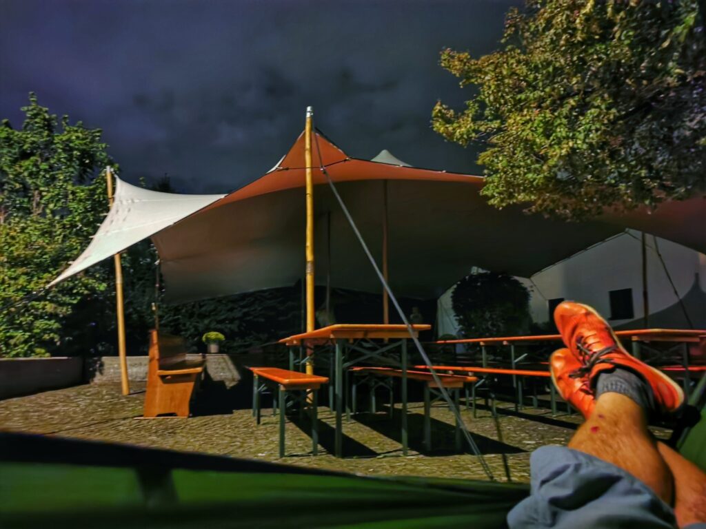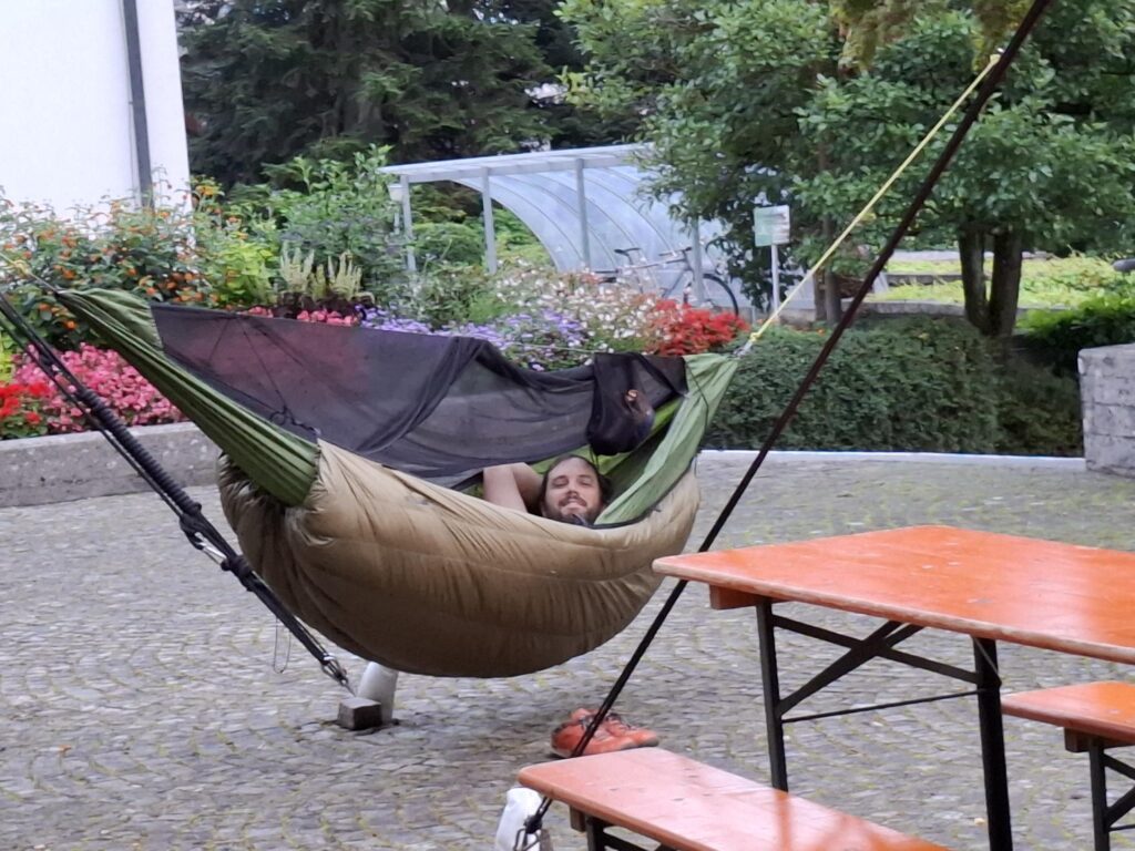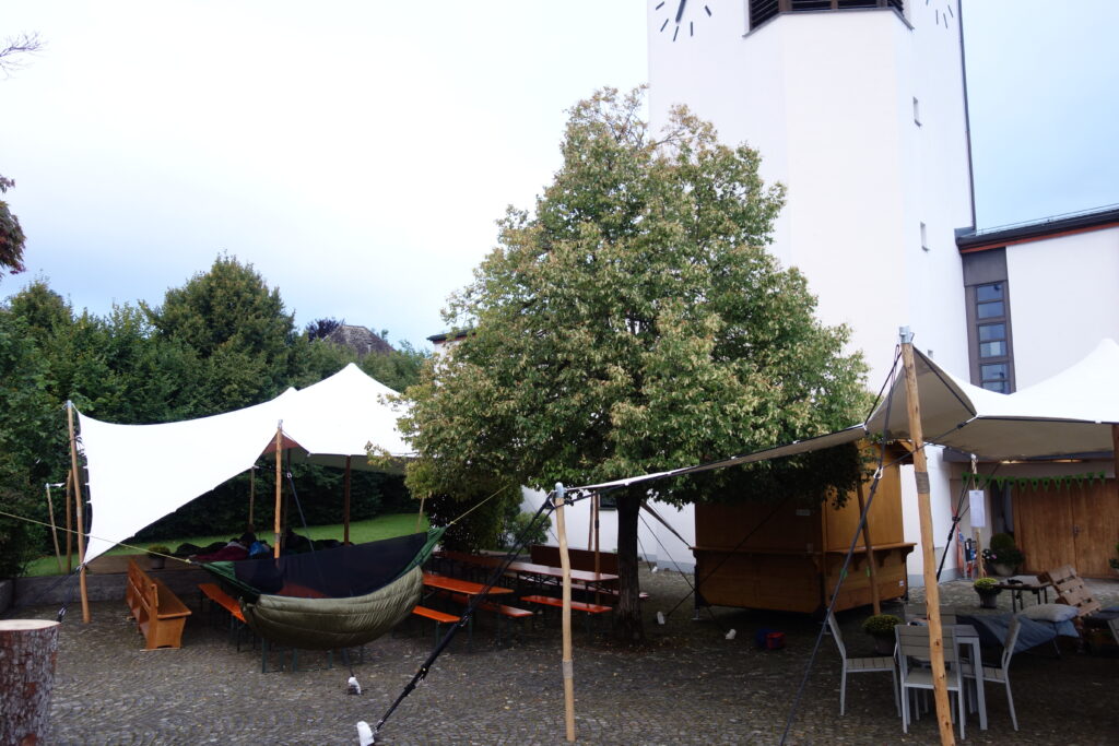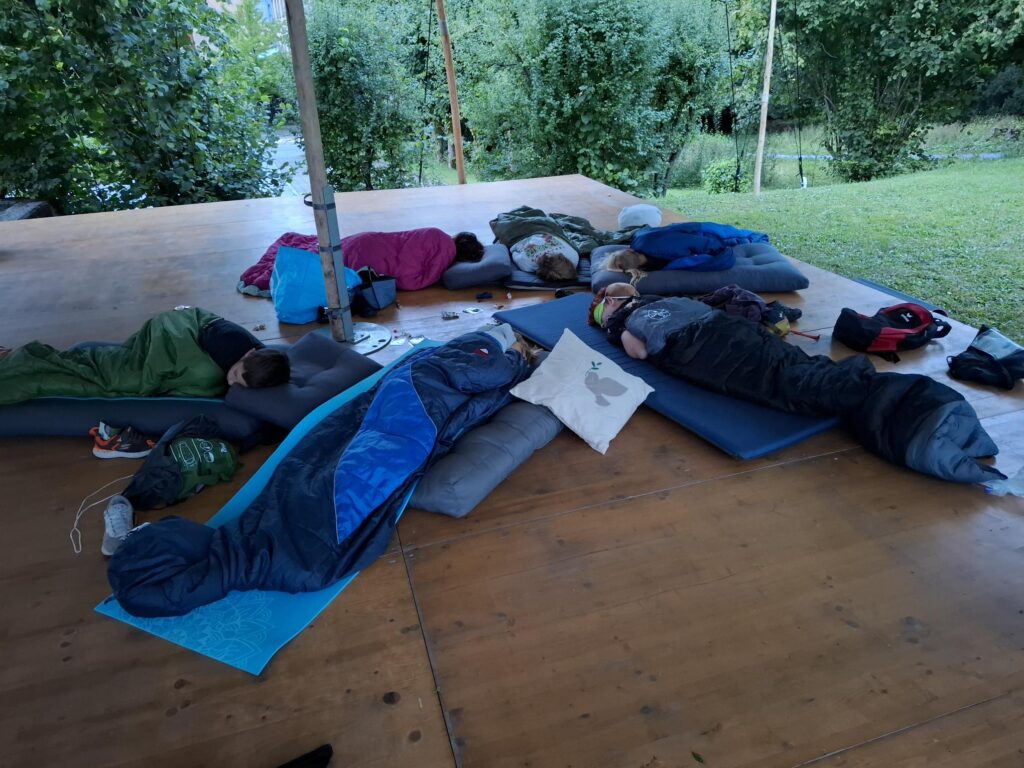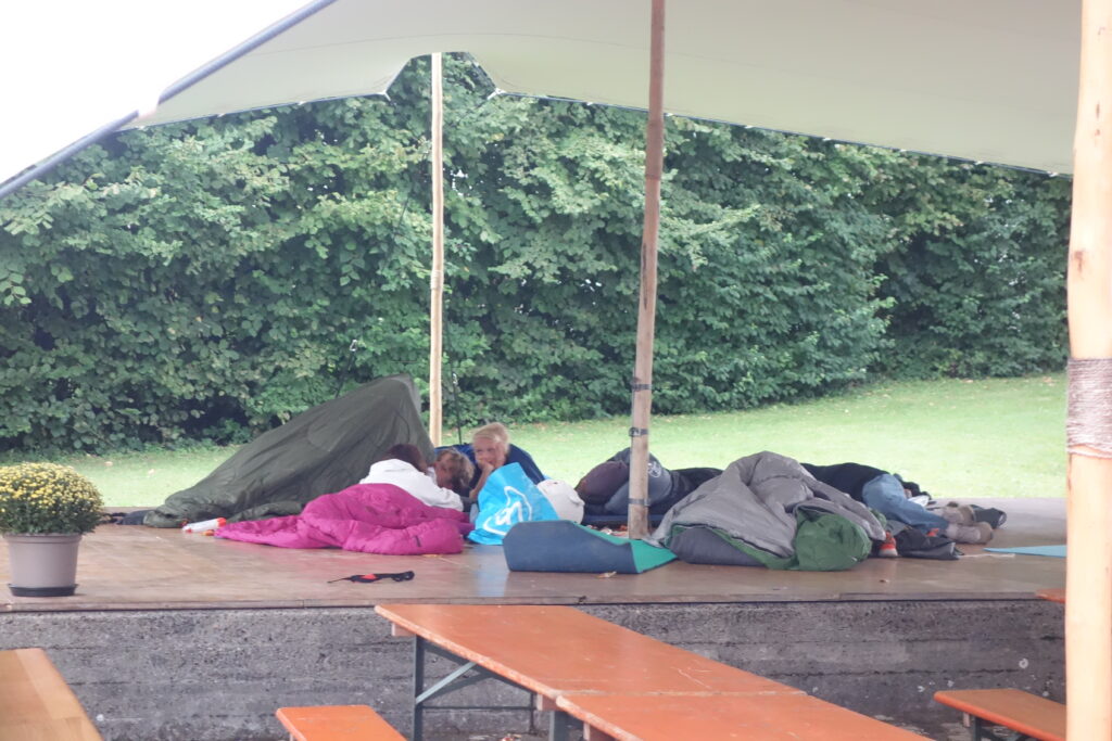 Im Rahmen des Konfweges können die Jugendlichen aus einem reichhaltigen Menü an Programmen auswählen. Eines davon war „Nacht im Park“. Zuerst gab es Schnitzelbrot vom Grill, anschliessend wurde viel gequatscht und gelacht und nach ein paar Runden Werwölflen wurden die „Schlaf“-plätze auf der Bühne von den Jugendlichen und etwas abseits von Daniel und Anita bezogen. Schwester Verena half Daniel beim Aufhängen seiner Hängematte. Während die beiden Leitenden Schlaf suchten, versuchten die Jugendlichen diesen eher zu vermeiden, es gab schliesslich noch sehr viel zu erzählen. Doch irgendwann wurden bei allen die Augenlider schwer.